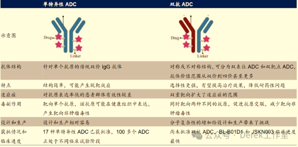 雙抗ADC相比于單特異性ADC具有多方面優(yōu)勢,在抗體結(jié)構(gòu)上,雙抗ADC為對稱或不對稱結(jié)構(gòu),包括雙表位ADC和雙靶點ADC,抗體價態(tài)從雙價到四價甚至更多,相比單特異性ADC針對單個抗原的傳統(tǒng)雙價IgG抗體結(jié)構(gòu),其選擇性更強;在治療效果上,單特異性ADC結(jié)構(gòu)簡單,可能產(chǎn)生脫靶效應(yīng),對低抗原表達率患者有效性差,而雙抗ADC雙重靶向擴大了適應(yīng)癥范圍,有望提高治療效果,降低耐藥性問題;在毒副作用方面,單特異性ADC靶向單個抗原,若該抗原在健康組織中表達,會產(chǎn)生靶向非腫瘤毒性,雙抗ADC同時靶向兩種不同抗原,能促進抗原交聯(lián),減少靶向非腫瘤毒性;不過在設(shè)計和生產(chǎn)上,單特異性ADC相對容易,雙抗ADC則因分子復雜性增加面臨設(shè)計和生產(chǎn)挑戰(zhàn)。