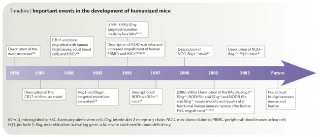 1995年,通過靶向敲除IL2rg基因,獲得了IL2rg-/-小鼠。它們的T細(xì)胞和B細(xì)胞發(fā)育和功能嚴(yán)重受損,且NK細(xì)胞發(fā)育被完全阻斷。IL2rg-/-小鼠的產(chǎn)生使更多固有免疫缺陷小鼠模型成為可能,可以大大降低人體細(xì)胞和組織的排斥率。