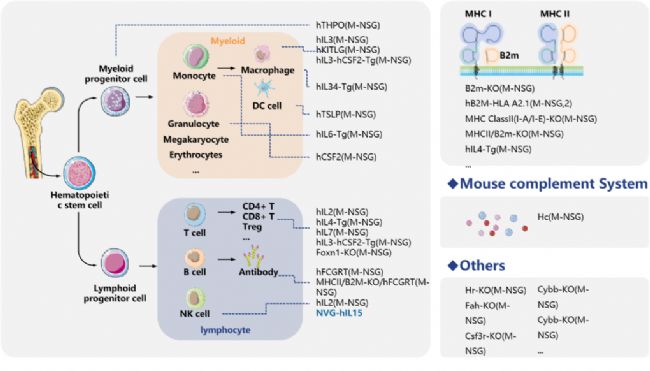 與M-NSG小鼠相似的小鼠品系有NOG和NSG等,分別是在02年和05年由日本實(shí)驗(yàn)室和美國實(shí)驗(yàn)室構(gòu)建。NOG小鼠的IL2rg缺乏胞內(nèi)結(jié)構(gòu)域,而NSG小鼠則完全缺失IL-2rg,二者的免疫缺陷程度與M-NSG相同,都表現(xiàn)出了無成熟T細(xì)胞、B細(xì)胞和功能性NK細(xì)胞,細(xì)胞因子信號傳遞能力缺失等。