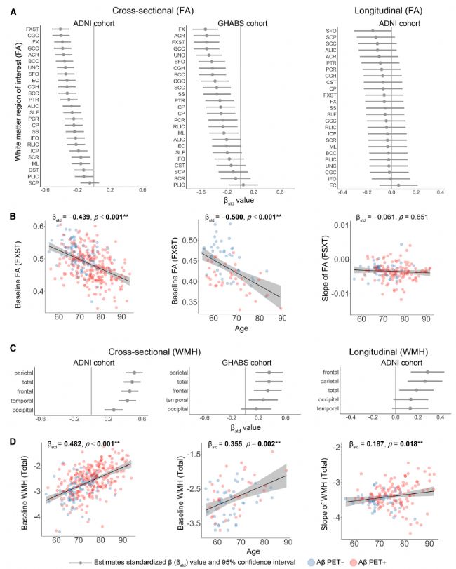 基于阿爾茨海默病神經(jīng)影像倡議(ADNI)和粵港澳大灣區(qū)健康老齡化腦研究(GHABS)兩大隊(duì)列,共納入328名ADNI參與者和78名GHABS參與者,收集了基線及縱向的Aβ PET、tau PET、擴(kuò)散磁共振成像(dMRI)和T2 FLAIR數(shù)據(jù)。研究通過(guò)廣義線性模型(GLM)和線性混合效應(yīng)模型(LME)分析FA和WMH與AD病理(Aβ和tau)、年齡、血管風(fēng)險(xiǎn)因素的關(guān)聯(lián),并依據(jù)修訂的AD生物分期標(biāo)準(zhǔn)(A/T profiles)進(jìn)行分組比較。實(shí)驗(yàn)設(shè)計(jì)強(qiáng)調(diào)了多模態(tài)數(shù)據(jù)的整合,Simoa技術(shù)可在此框架下用于驗(yàn)證血液生物標(biāo)志物與影像發(fā)現(xiàn)的相關(guān)性。