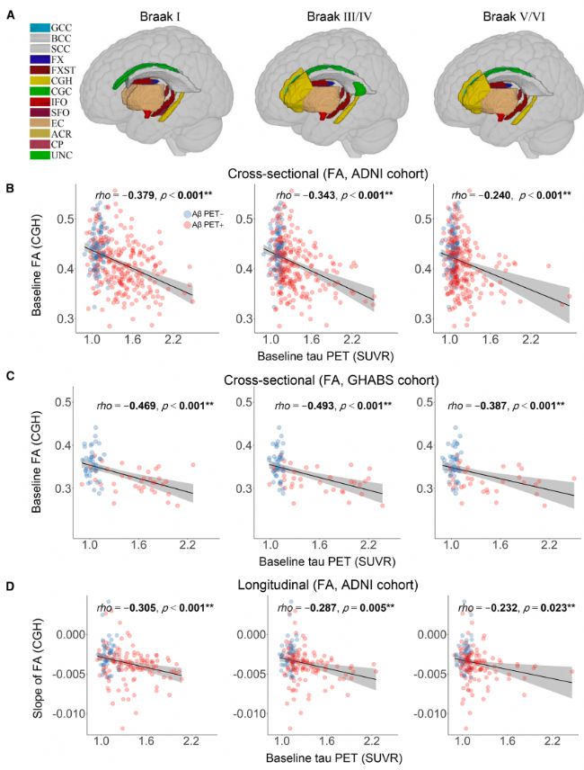 通過(guò)tau PET成像顯示,Braak I-VI區(qū)域的tau標(biāo)準(zhǔn)攝取比值(SUVR)與多個(gè)WM腦區(qū)的FA水平呈負(fù)相關(guān)(如海馬扣帶回CGH、穹窿FX等),且縱向數(shù)據(jù)表明tau聚集加速了FA下降。這一發(fā)現(xiàn)提示tau蛋白是微結(jié)構(gòu)WM退化的主要驅(qū)動(dòng)因子。Simoa技術(shù)的高靈敏度可直接檢測(cè)血液中的tau蛋白(如pTau-181、pTau-217),與PET數(shù)據(jù)形成互補(bǔ)。