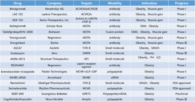 為此,新一代療法正聚焦于"減脂增肌"的雙重目標(biāo)。目前活躍的研發(fā)方向涵蓋激活素受體ACVR、肌肉生長抑素MSTN、抑制素亞基βE(INHBE)、Apelin受體APJ、甲狀腺激素受體β(THRβ)、選擇性雄激素受體調(diào)節(jié)劑(SARM)、瘦素leptin、黑色素受體MC4R、GDF15及Ghrelin受體等關(guān)鍵靶點。部分單靶點藥物或GLP-1多靶點聯(lián)合方案已進入I-III期臨床試驗階段。
