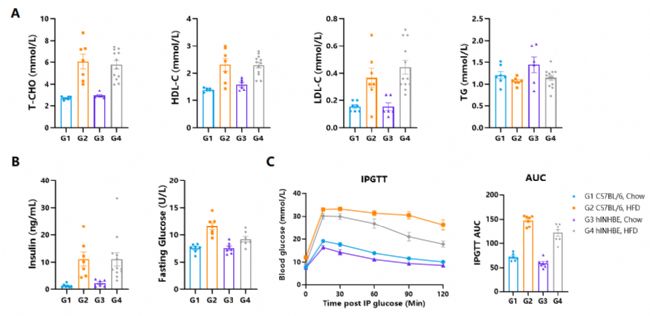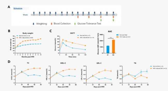 圖. HFD誘導(dǎo)的DIO小鼠的體重(B)、GTT(C)及血脂檢測(D)。結(jié)果顯示,DIO小鼠體重相較對照組明顯增加,并出現(xiàn)明顯的糖耐量異常及血脂異常。