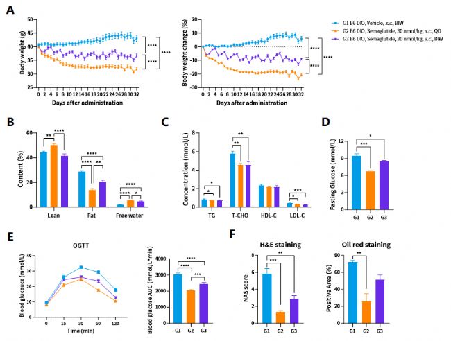 圖. Semaglutide對HFD誘導(dǎo)的DIO小鼠體重(A)、體成分(B)、血脂四項(C)、饑餓血糖(D)、糖耐量(E)及病理學(xué)(F)的影響。結(jié)果表明,Semaglutide可顯著降低DIO小鼠的體重及脂肪含量,改善血脂四項水平、糖耐量、饑餓血糖等。