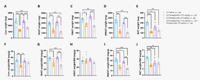 圖. Semaglutide與Bimagrumab聯(lián)用對HFD誘導(dǎo)的DIO小鼠肝臟和各脂肪組織重量的影響。結(jié)果表明,Semaglutide與Bimagrumab聯(lián)用可顯著降低DIO小鼠的降低脂肪含量。