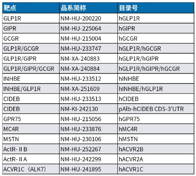 此外,南模生物開發(fā)了系列靶點人源化小鼠,可用于當(dāng)前肥胖疾病減脂增肌藥物的臨床前研究。部分列表如下: