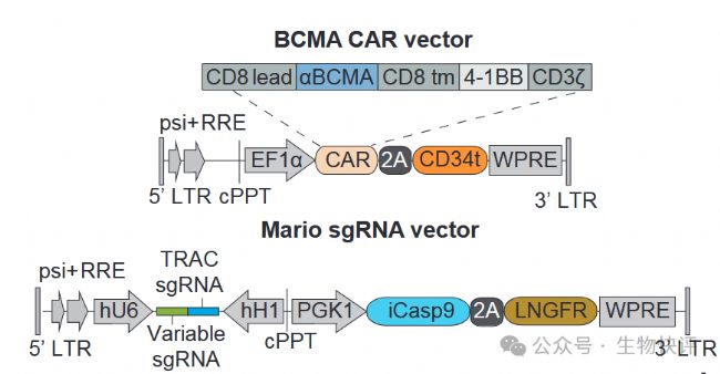 載體1:靶向BCMA的CAR(4-1BBZ結(jié)構(gòu)),這個CAR后面利用2A連接CD34t(短截體的CD34),該載體是表達(dá)CAR所用,CD34t是便于檢測CAR表達(dá)。