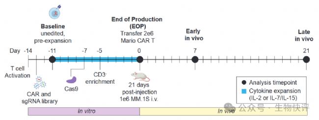 首先活化T細(xì)胞,然后制備含有BCMA-CAR的慢病毒和含有g(shù)RNA的文庫的慢病毒。