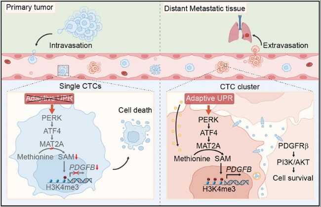 CTC clusters激活適應(yīng)性UPR,進而刺激PERK-ATF4-MAT2A軸以調(diào)節(jié)細胞內(nèi)SAM可用性。CTC clusters中SAM積累誘導(dǎo)PDGFB啟動子處H3K4me3修飾,導(dǎo)致PDGFB表達增強。分泌的PDGFB在細胞簇的細胞間區(qū)域積累,為簇內(nèi)細胞提供共有存活信號,從而維持CTC clusters在血流中存活。