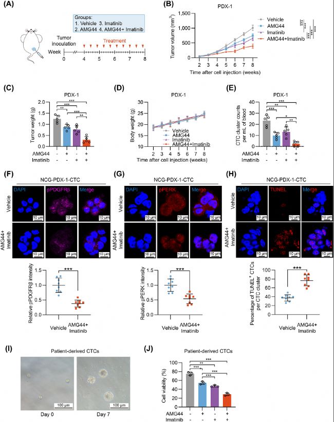 在PDX模型中,PERK抑制劑AMG44與PDGFRβ抑制劑伊馬替尼聯(lián)用,顯著降低CTC clusters數(shù)量、原發(fā)腫瘤負荷和肺轉(zhuǎn)移;颊邅碓吹腃TC體外實驗證實聯(lián)合用藥可協(xié)同抑制細胞活力,表明雙重靶向PERK和PDGFRβ具有臨床轉(zhuǎn)化潛力。