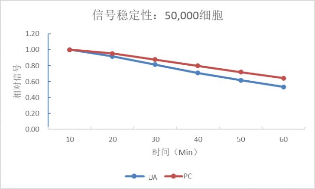 上圖將 10min的檢測(cè)值設(shè)為1,計(jì)算其他時(shí)間點(diǎn)的檢測(cè)值和10min檢測(cè)值的比值。以對(duì)10min歸一化的數(shù)據(jù)對(duì)檢測(cè)時(shí)間作圖,結(jié)果表明UA-Glo One-luc熒光素酶檢測(cè)試劑信號(hào)穩(wěn)定性和PC品牌試劑相仿