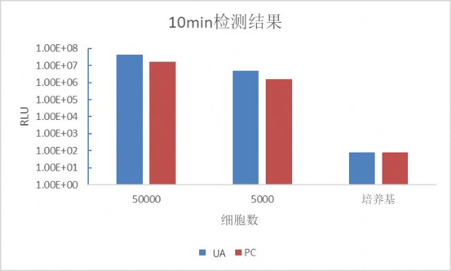 上圖顯示10min時(shí)對(duì)轉(zhuǎn)染螢火蟲(chóng)熒光素酶報(bào)告基因的HEK293細(xì)胞的檢測(cè)結(jié)果。 結(jié)果表明UA-Glo One-luc熒光素酶檢測(cè)試劑和PC品牌試劑在檢測(cè)線性(50,000和5,000細(xì)胞檢測(cè)值之比)和背景檢測(cè)值(含10% FBS 的DMEM)相仿, 而UA-Glo One-luc熒光素酶檢測(cè)試劑檢測(cè)值明顯高于PC品牌試劑。注意Y-坐標(biāo)為對(duì)數(shù)以顯示背景值。