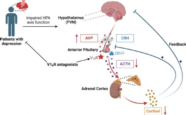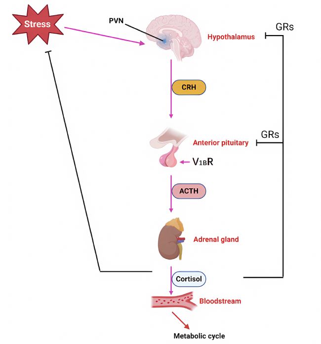V1B受體最主要的功能位于前腦垂體,它在刺激促腎上腺皮質(zhì)激素釋放中扮演關(guān)鍵角色。當(dāng)身體面臨壓力時,下丘腦釋放的精氨酸加壓素與垂體中的V1B受體結(jié)合,刺激ACTH釋放,最終激活腎上腺,增加皮質(zhì)醇的生成。如下圖所示: