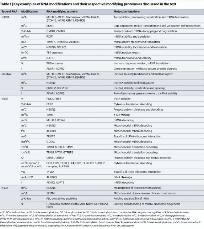 表1:文中所述RNA修飾及其相應(yīng)修飾蛋白的關(guān)鍵示例