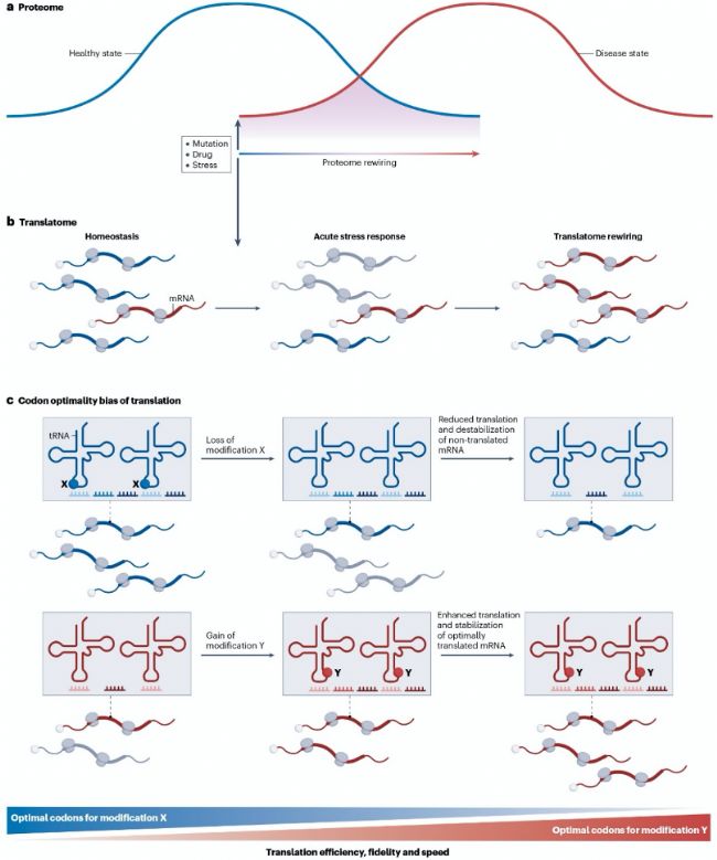 tRNA修飾在適應(yīng)蛋白合成中具多重調(diào)控作用。營(yíng)養(yǎng)應(yīng)激可改變tRNA的氨;剑瑢(dǎo)致蛋白質(zhì)合成減慢或密碼子使用模式改變;擺動(dòng)位點(diǎn)(wobble position)修飾可產(chǎn)生轉(zhuǎn)錄本特異性翻譯效應(yīng)并增強(qiáng)細(xì)胞適應(yīng)性,細(xì)胞缺失修飾在解決應(yīng)激誘導(dǎo)的蛋白聚集方面存在缺失。