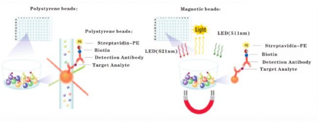 Luminex 液相芯片技術(shù):以熒光編碼微球?yàn)楹诵妮d體,融合流式分析、激光檢測(cè)與高速信號(hào)處理技術(shù),實(shí)現(xiàn)單一樣本中 2-100 種因子的并行定量。該技術(shù)兼具寬檢測(cè)范圍(pg/mL~ng/mL)與優(yōu)異的批內(nèi)、批間重復(fù)性,能高效完成大批量樣本的 IL-8 及炎癥網(wǎng)絡(luò)相關(guān)因子同步檢測(cè),是疾病分型標(biāo)志物篩選、批量隊(duì)列研究及多通路協(xié)同分析的優(yōu)選方案。