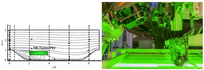 在歐盟項目 AFDAR("航空研究高級流量診斷")范圍內(nèi)進行的一項實驗將用于證明此方法對實際實驗數(shù)據(jù)的適用性。實驗是在慕尼黑技術(shù)大學的水洞設施中進行的。一系列相同的縱向山丘周期性山丘,后面的流動進行了研究,使用高速斷層PIV系統(tǒng)。六個專業(yè)成像儀器pco.dimax S4高速相機(元奧儀器的pco.dimax)被用來觀察測量體積為80x80x20毫米,位于第七座山的下游2小時(100毫米,實驗總共使用了10個連續(xù)的山)。墻的正常高度跨度從25到45毫米以捕捉剪切層。用~30um的聚酰胺粒子對水進行播種。照明是使用由連續(xù)激光器實現(xiàn)的。激光束被連續(xù)兩個使用圓柱透鏡的望遠鏡光學器件擴寬,形成橢圓形光輪廓。型材切割成矩形形狀的通道,這是固定在側(cè)壁的通道。該體積光片穿過審訊體積,并利用位干隧道對面墻壁正前方的端面反射鏡向自身反光。第二個路路通被安裝在那里。這種設置使所有的攝像機都在前向散射,從而收集最大的光。為了確保成像粒子具有足夠的對比度,在成像粒子下方安裝了黑色粘合箔片。
