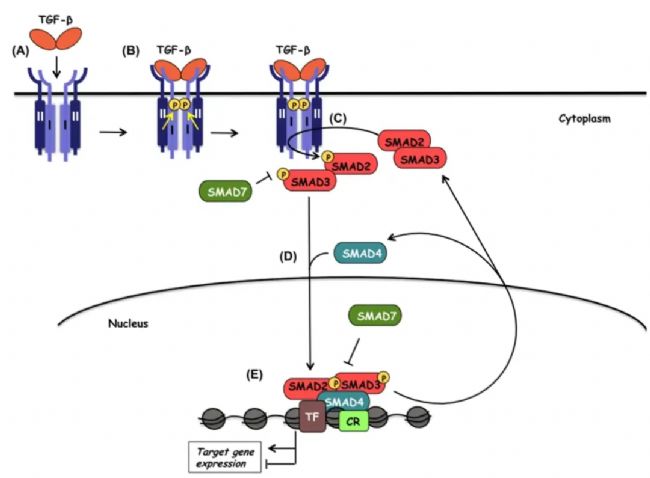 TGF-β家族成員涵蓋TGF-β1/2/3、BMP、Activin等多種配體,其信號啟動依賴與細(xì)胞膜上II型受體(TβRII)和I型受體(TβRI)的特異性結(jié)合,形成異四聚體復(fù)合物。首先由II型受體激酶磷酸化I型受體的GS結(jié)構(gòu)域,激活其內(nèi)在激酶活性,完成信號起始的關(guān)鍵步驟。
