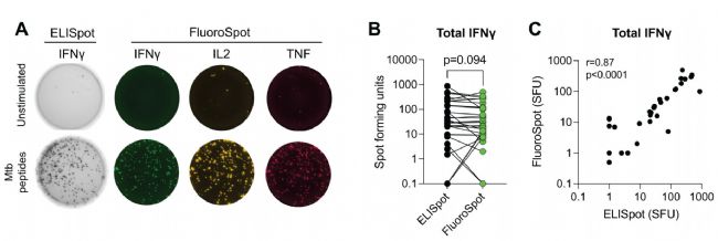 圖1:IFNγ-ELISpot和FluoroSpot檢測結(jié)果顯示,使用ESAT-6、CFP-10和EspC刺激后,斑點(diǎn)形成單位(SfU)的檢測結(jié)果高度一致。