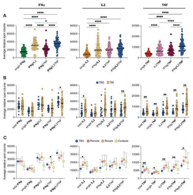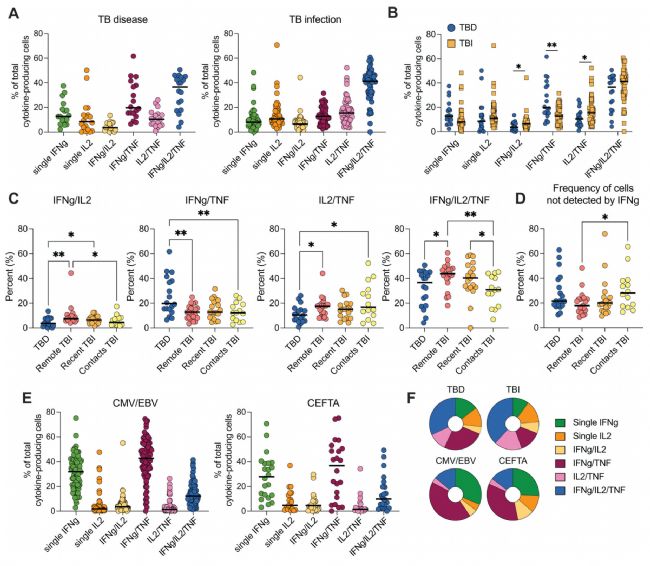 對(duì) TB 防控而言,“區(qū)分感染階段” 比 “單純確診” 更重要 —— 近期感染者進(jìn)展為活動(dòng)性疾病的風(fēng)險(xiǎn),遠(yuǎn)高于遠(yuǎn)期感染者。而研究團(tuán)隊(duì)這套方案,恰好能捕捉這種 “階段差異”:研究發(fā)現(xiàn),近期感染(暴露 <6 個(gè)月)者的 IL-2/TNF-α 細(xì)胞占比更高,IFNγ 反應(yīng)較弱;而活動(dòng)性疾病患者則以 IFNγ/TNF-α 細(xì)胞為主;遠(yuǎn)期感染者(>24 個(gè)月)的三重陽性細(xì)胞比例會(huì)逐漸升高。這種清晰的 “細(xì)胞因子圖譜”,讓醫(yī)生能一眼識(shí)別 “誰是近期感染者”“誰已發(fā)展為疾病”,精準(zhǔn)分配預(yù)防性治療資源,避免 “一刀切”。