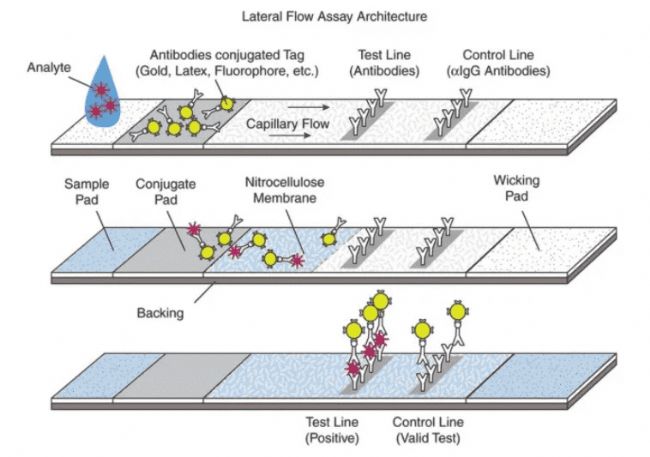[4]。設(shè)計原理如下:在結(jié)合墊中除了用于檢測待分析目標(biāo)的金標(biāo)抗體外,還包被有抗DNP的金標(biāo)抗體,當(dāng)層析進行時,抗DNP標(biāo)記抗體會隨液體遷移至質(zhì)控線,隨后與固定在C線處的DNP-BSA(2,4-二硝基苯偶聯(lián)牛血清白蛋白,AbMole,M58157)發(fā)生特異性結(jié)合,不斷累積后也會形成可視化信號。因為上述過程獨立于目標(biāo)分析物的存在,所以可用于證明檢測結(jié)果的有效性,即有效區(qū)分了"真陰性"與"系統(tǒng)失效導(dǎo)致的假陰性"。上述試劑均僅供科學(xué)研究和檢測使用。