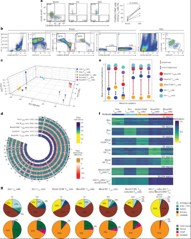 c. 對來自9例健康女性供者的血液和皮膚和血液中分離的血液CD45RA+ Treg細胞(RA+ Treg細胞)、血液CD45RA+ Tconv細胞(RA+ Tconv細胞)、血液CCR8+ Treg細胞、皮膚Tconv細胞和皮膚Treg細胞進行DNA甲基化主成分分析。