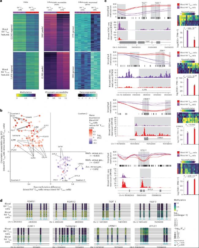 a. 血液CD45RA+ Treg細胞(RA+ Treg細胞)與血液CD45RA+ Tconv細胞(RA+ Tconv細胞)之間差異甲基化區(qū)域(左)、差異可及性peaks(中)和差異表達基因(右)的甲基化、染色質(zhì)可及性和表達。