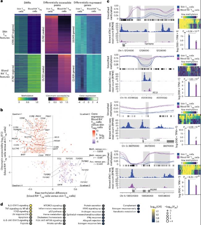 a. 皮膚Treg細胞與血液CD45RA+ Treg細胞(血液RA+ Treg細胞)之間差異甲基化區(qū)域(左)、差異可及性峰(中)和差異表達基因(右)的甲基化、染色質(zhì)可及性和表達情況。