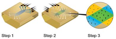 與傳統(tǒng)的SPR生物傳感器一樣,最新一代技術(shù)也是將一個分子固定在芯片上,叫做ligand,另一個分子在溶液中流過ligand,叫做analyte。所不同的是兩者的工作方式。以Bio-Rad公司的ProteOn XPR36系統(tǒng)為例,它有一套非常獨特的流動池,稱之為MCM(Multi- Channel Module)。MCM上有6條平行的凹槽,它先以垂直方向扣在芯片表面上,就形成了垂直方向上的6條平行通道,用以標記ligand,如下圖“Step 1”。隨后MCM旋轉(zhuǎn)90°后再芯片表面結(jié)合,就形成6條與原先交叉的通道,可以同時流過6個不同濃度的analyte,如下圖“Step 2”。這樣兩組通道交叉形成36個互做位點,如下圖“Step 3”所示,可以實現(xiàn)一次analyte注入就完成它和最多6個ligand結(jié)合的動力學常數(shù)(Kon、Koff)和解離平衡常數(shù)(KD)的測定 ,而無需反復再生ligand。這種分析方式就稱之為平行分析。而此前的SPR傳感器芯片上不管有多少位點,都只能一次讓一個濃度的analyte溶液流過芯片,叫做順序分析。