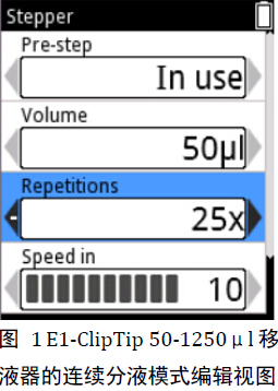 當(dāng)連續(xù)分液所需溶液的總體積接近移液器的最大量程時,建議使用連續(xù)分液Stepper模式,該模式已經(jīng)默認(rèn)為吸入一個額外的體積。例如,當(dāng)用10-300 μl 移液器進行10 x 30 μl的分液操作時,推薦使用stepper模式。