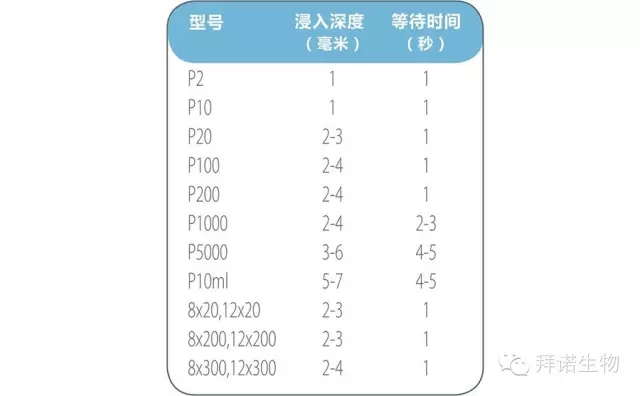 tips:不同型號移液器,吸嘴浸入液體深度及等待時(shí)間也不一樣。