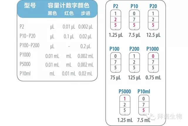 調(diào)節(jié)容量計(jì),設(shè)定所需移取液體的體積,根據(jù)移液器的不同型號,容量計(jì)數(shù)字顏色可能是黑色或紅色的。