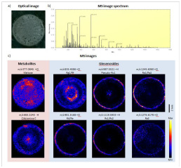 圖1.基于DESI質(zhì)譜成像得到人參根橫切片中人參皂苷的分布狀況3。a)人參根橫切片的光學(xué)圖像。b)總質(zhì)譜圖。c)Maltose, Citbismine C和人參皂苷包括Rg1/Rf,pseudo-Rc1, Ra1/Ra2,Rd/Re,Rs1/Rs2和Ra3的DESI質(zhì)譜成像結(jié)果。
