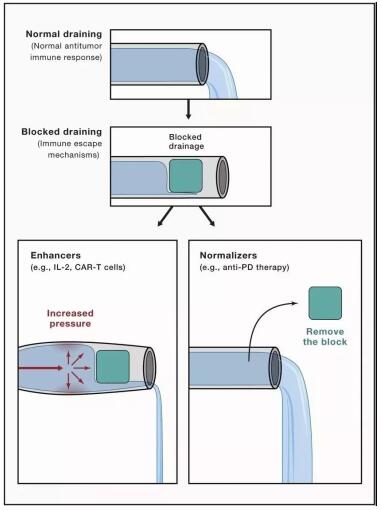 文章中將免疫反應過程比作一條有流水的通道。在這個過程中,正常的免疫反應就是通道中正常通暢的水流。如果通道堵塞,水流受到影響,通道將無法充分排水。在這種情況下,“增強”策略可以解釋為增加通道的壓力,以克服排水不足,但如果通道內壓力增加太多,就會有破壞通道的風險。反之,“正;辈呗詣t會通過識別并解除阻塞以恢復正常水流,避免危及通道管壁。