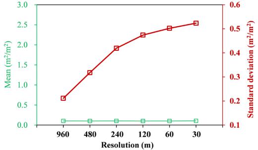 過程,構(gòu)建了復(fù)雜山地多尺度 LAI 遙感反演模型,生成 了 960m 、480m 、240m 、 120m 、60m 和 30m 尺度 LAI