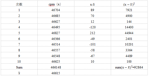 這些數(shù)據(jù)可通過計(jì)算兩個(gè)參數(shù)來描述:平均值和標(biāo)準(zhǔn)偏差。平均值 () 被定義為 CPM 的總和除以被計(jì)數(shù)樣品的計(jì)數(shù)次數(shù)(i),表示為。因此從表 1 來看,466148 CPM/10 = 46615,這就是平均值 CPM。接下來必須獲得這 10 個(gè)樣品計(jì)數(shù)的標(biāo)準(zhǔn)偏差。標(biāo)準(zhǔn)偏差可通過下面的公式獲得: