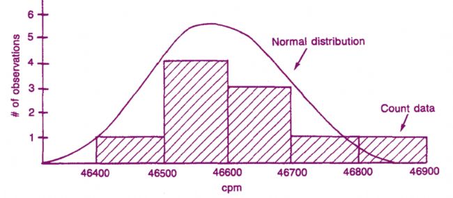 因此,該樣品計(jì)數(shù)十次的計(jì)數(shù)結(jié)果表示為(平均值)46615±S.D. 或 46615±102 CPM,F(xiàn)在我們可以計(jì)算標(biāo)準(zhǔn)偏差,但 S.D. (±102 CPM) 對于核計(jì)數(shù)的真正意義是什么?我們可通過圖 1 來清楚說明,圖中顯示了重疊在實(shí)際計(jì)數(shù)數(shù)據(jù)上的正態(tài)分布(高斯分布)(表 1)。計(jì)數(shù)數(shù)據(jù)以柱狀圖表示。