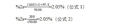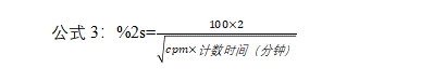 因此,在 95.5% 的置信界限內(nèi),計(jì)數(shù)的統(tǒng)計(jì)結(jié)果(實(shí)例 2)可表示為 9500±195 次計(jì)數(shù)。這一表達(dá)結(jié)果的方法相當(dāng)笨拙(因?yàn)榭赡塬@得非常多的數(shù)字)。為更方便起見,我們計(jì)算了 %2s值。%2s 值可根據(jù)公式1或者公式 2(公式 1 的數(shù)學(xué)簡化)計(jì)算得到。實(shí)例 2中數(shù)據(jù)的%2s 值顯示在實(shí)例 3中。