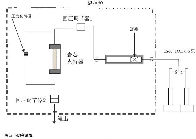 Isco柱塞泵 本文選擇了ISCO 100DX型帶有電動(dòng)閥的雙泵系統(tǒng)。測(cè)試系統(tǒng)基本上由一個(gè)巖心夾持器、兩個(gè)回壓調(diào)節(jié)器、一個(gè)中間容器、壓力表和泵組成。巖心夾持器、回壓調(diào)節(jié)器和中間容器安裝在溫控烘箱內(nèi)。