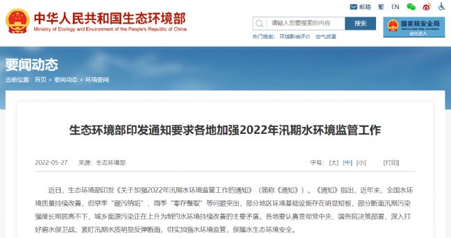 今年5月,生態(tài)環(huán)境部印發(fā)《關于加強2022年汛期水環(huán)境監(jiān)管工作的通知》(簡稱《通知》),要求各地加強風險防范,做好突發(fā)水污染事件應對。凡涉及飲用水安全、重金屬污染,以及可能造成跨省污染的突發(fā)水污染事件,要第一時間向生態(tài)環(huán)境部報告,迅速啟動應急響應,采取有效措施妥善處置。