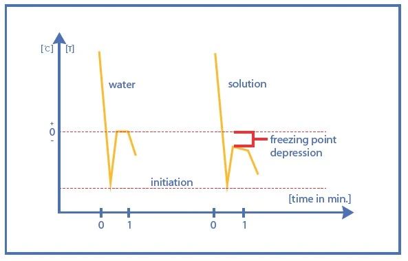 純凈水溫度降到凝固點(diǎn)后會(huì)凝固成冰,若有溶質(zhì)溶于水,會(huì)降低溶液的凝固點(diǎn),而下降的溫度值符合ΔTf = Kf·m 的關(guān)系(ΔT:冰點(diǎn)下降值,Kf:冰點(diǎn)下降常數(shù),m:摩爾濃度),Gonotec OSMOMAT 3000 系列滲透壓儀就是通過測(cè)量冰點(diǎn)下降的值來測(cè)得溶液的滲透壓值。