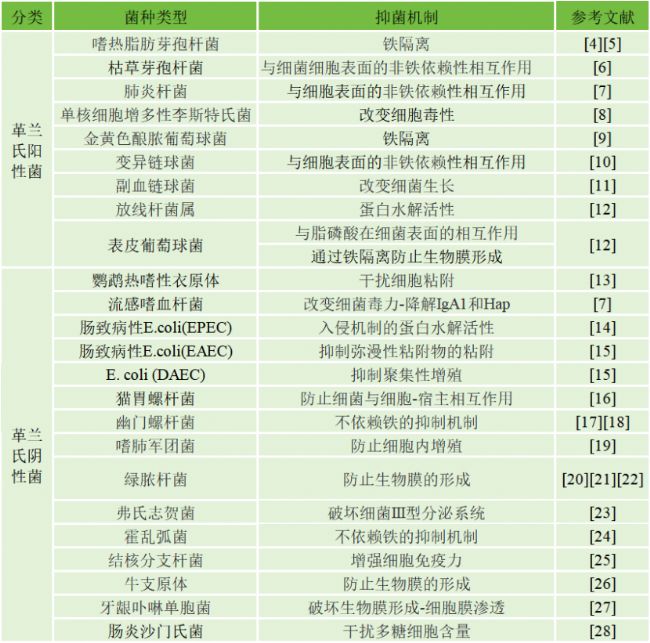 大量研究者研究了乳鐵蛋白對(duì)于革蘭氏陽性菌(G+)和革蘭氏陰性菌(G-)在體內(nèi)和體外的抑菌性能和機(jī)制,簡單匯總?cè)缦拢?/p>