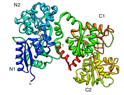 乳鐵蛋白是一個(gè)由約700個(gè)氨基酸組成的80kDa糖基化蛋白,在物種間具有高度同源性。乳鐵蛋白擁有兩個(gè)對(duì)稱的同源球狀域:N-環(huán)和C-環(huán);N-環(huán)對(duì)應(yīng)于肽鏈中的第1-333個(gè)氨基酸殘基,而C-環(huán)與第345-692個(gè)氨基酸殘基對(duì)應(yīng),這兩個(gè)域的兩端由一段短鏈α-螺旋相連接。每個(gè)環(huán)有兩個(gè)子域(亞域):N1、N2和C1、C2 組成,并分別包含一個(gè)鐵結(jié)合位點(diǎn)和一個(gè)糖基化位點(diǎn) [1]。