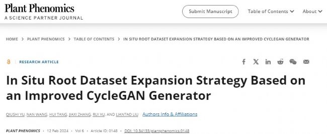 2024年2月,Plant Phenomics 在線發(fā)表了河北農(nóng)業(yè)大學(xué)機(jī)電工程學(xué)院團(tuán)隊(duì)題為In Situ Root Dataset Expansion Strategy Based on an Improved CycleGAN Generator 的研究論文。