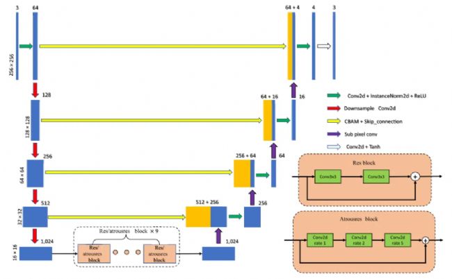 圖2是改進(jìn)后的發(fā)電機(jī)示意圖,對(duì)于生成器,我們比較了以下變化:將生成器網(wǎng)絡(luò)改為4層下采樣,并在解碼器對(duì)應(yīng)的每一層增加跳過連接和CBAM關(guān)注模塊。使用了Pixelshuffle算法,而不是原來的卷積上采樣。此外,用擴(kuò)張率分別為1、2、5的擴(kuò)展卷積組合代替殘差塊中的卷積。