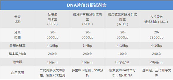 目前有4種片段分析試劑盒適用于GeneCE-100生物片段分析系統(tǒng),主要用于gDNA、cfDNA、FFPE樣本、PCR產(chǎn)物、打斷文庫等樣本的DNA片段大小和濃度檢測。相較于傳統(tǒng)電泳具有分辨率高、分離速度快、樣本消耗低、檢測靈敏度高及自動(dòng)化程度高等優(yōu)點(diǎn)。