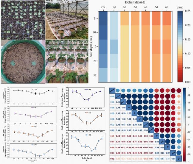 葉綠素熒光成像儀對棉花品種‘新陸早 26 ’開展研究。上左圖為棉花實驗照片;上右圖為干旱過程中不同土壤深度的土壤含水量變化;下左圖為干旱和復水過程中光能轉換效率(a)和穩(wěn)態(tài)熒光衰減率(b)在消耗與恢復期間的變化情況;下右圖為各種生理特征之間的相關系數(shù)矩陣。結果表明,干旱會導致棉花葉綠素熒光參數(shù)下降,復水后其恢復程度與干旱時長相關。