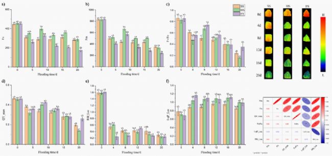 葉綠素熒光成像儀對桑樹進行淺度浸沒(SS)、半浸沒(HS)、完全浸沒(FS)3 個水澇深度處理并檢測葉綠素熒光參數(shù),左圖 a)-f) 分別為水澇脅迫對桑樹 Fo、Fm、 Fv/Fo 、QY_max 、Rfd_Lss 和 1-qP_Lss 的影響,上右圖為桑樹幼苗在浸水脅迫下 QY_max 值變化的熒光成像;下右圖為不同水澇處理下桑樹葉綠素熒光指數(shù)變化的關聯(lián)分析。結果表明:水澇脅迫下桑樹葉綠素熒光參數(shù)先降后穩(wěn),PS II 反應中心活性受抑制且與水澇深度和時長相關。