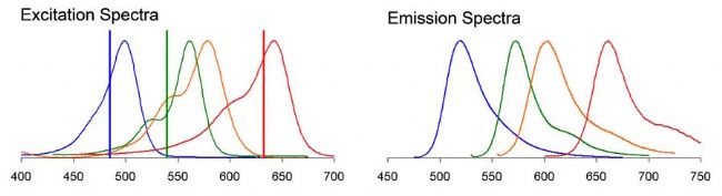考慮是否可以用具有更窄發(fā)射峰和/或更大斯托克斯位移(激發(fā)和發(fā)射最大值之間的分離)的染料替代潛在問(wèn)題熒光染料。例如,熒光量子點(diǎn)(QD)具有多種適合多重標(biāo)記的特性,包括相對(duì)較窄和對(duì)稱的發(fā)射曲線、光譜中均勻分布的多種顏色選擇,以及能夠使用相同激發(fā)波長(zhǎng)同時(shí)激發(fā)多個(gè)光譜變體的能力。一些基因編碼的熒光蛋白(FP)也經(jīng)過(guò)工程改造以改善多重標(biāo)記,例如Keima和LSSmOrange,它們具有異常大的斯托克斯位移,使得與傳統(tǒng)熒光蛋白和化學(xué)染料結(jié)合時(shí)能夠進(jìn)行單次激發(fā)的多色成像。