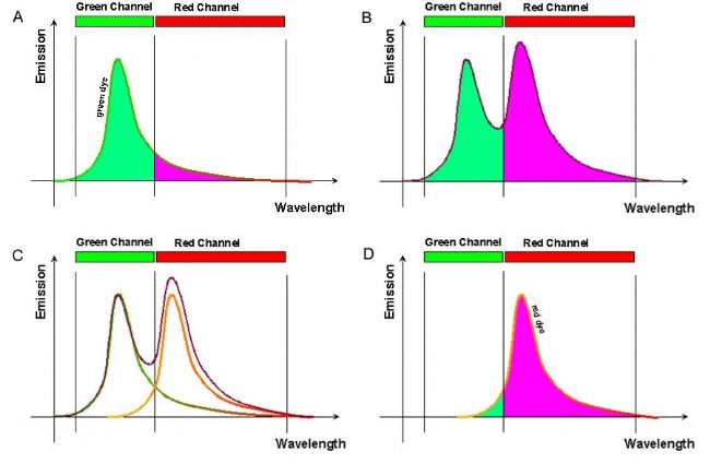 為了說(shuō)明串色如何影響實(shí)驗(yàn)結(jié)果,圖 2(A)顯示了僅兩個(gè)熒光染料的典型激發(fā)曲線,一個(gè)綠色和一個(gè)紅色。如圖 B 所示,這兩種染料的相應(yīng)發(fā)射曲線重疊。如果樣品中兩種染料的發(fā)射水平不可比,重疊的相對(duì)比例可能會(huì)更顯著(C)。當(dāng)發(fā)射的光通過(guò)檢測(cè)器(在這個(gè)假設(shè)的情況下通過(guò)帶通濾光片)時(shí),兩個(gè)熒光染料的信號(hào)都在紅色通道中被檢測(cè)到(D)。